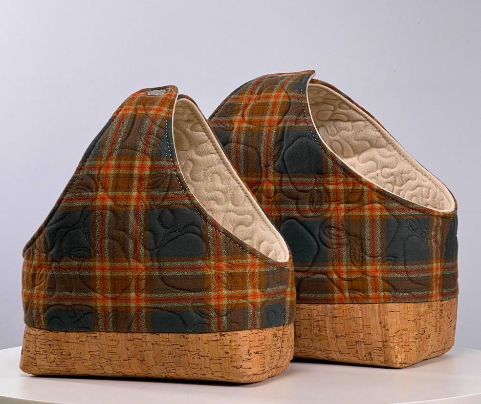 - Exterior Fabric: Cotton Flannel: Green & Orange Plaid with Vinyl Cork Bottom